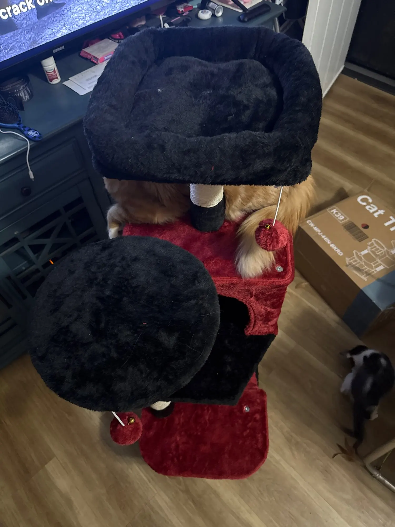 - Plush Surfaces - Soft, comfortable fabric covering on platforms and hideaway for cozy resting