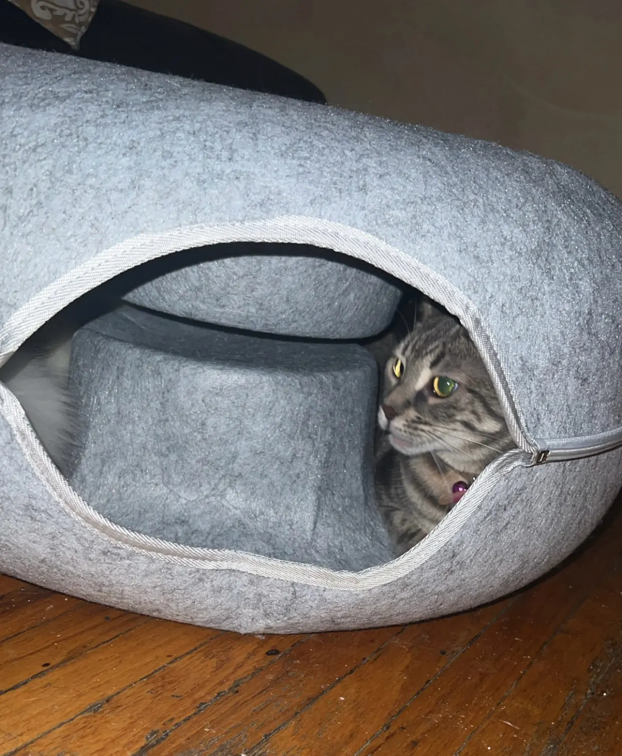 Give your cat the gift of endless entertainment and comfort! This delightful donut bed with interactive tunnel is more than just a place to sleep - it's a complete play and rest station. Watch your cat dash through the tunnel during playtime, then curl up inside the cozy donut for a well-deserved nap. The soft felt material provides warmth and comfort, while the enclosed design appeals to cats' natural instinct to seek out safe, snug spaces. Perfect for keeping indoor cats mentally stimulated and physically active. Your cat will love having their own special hideaway that's as fun as it is comfortable!