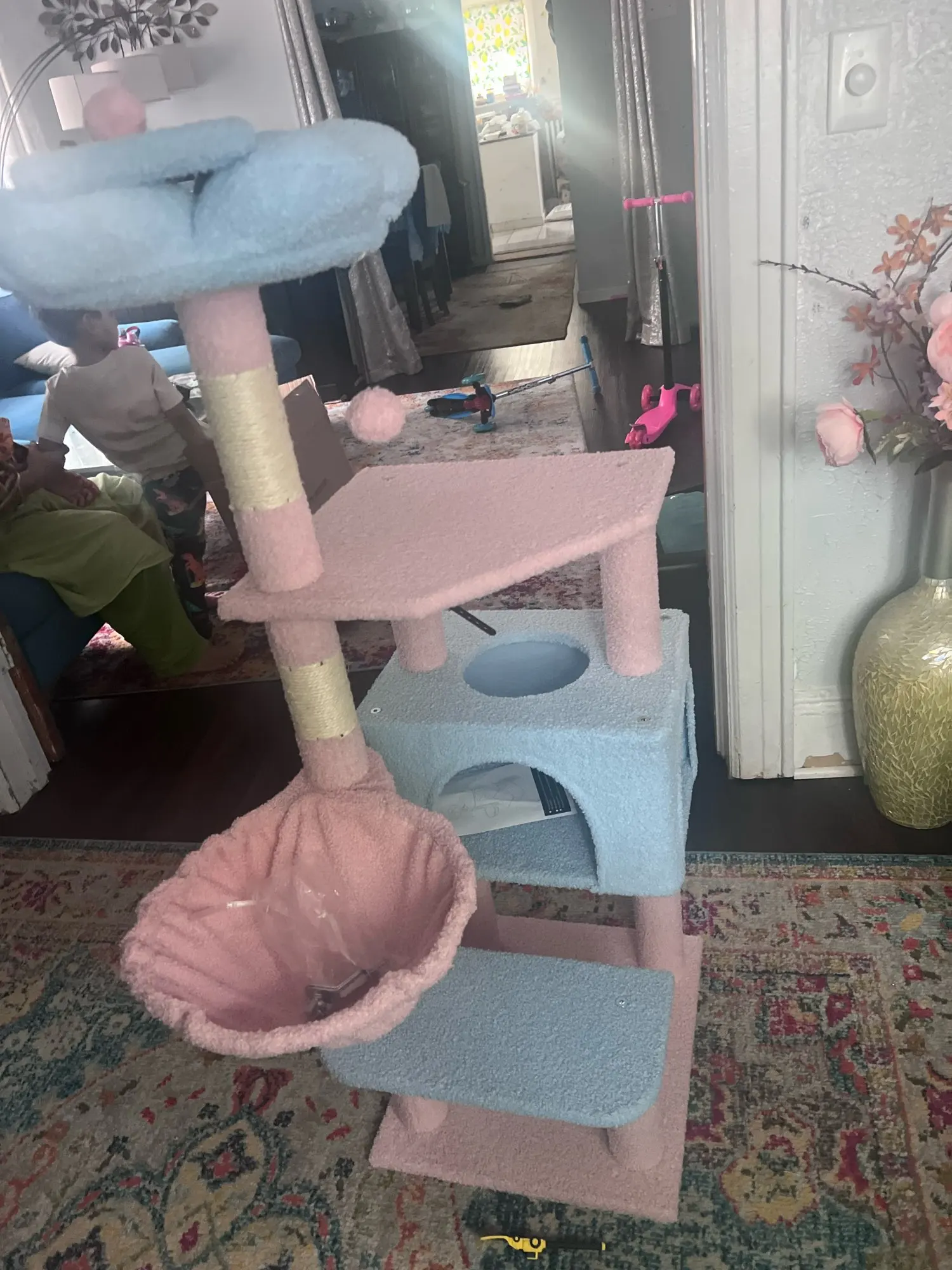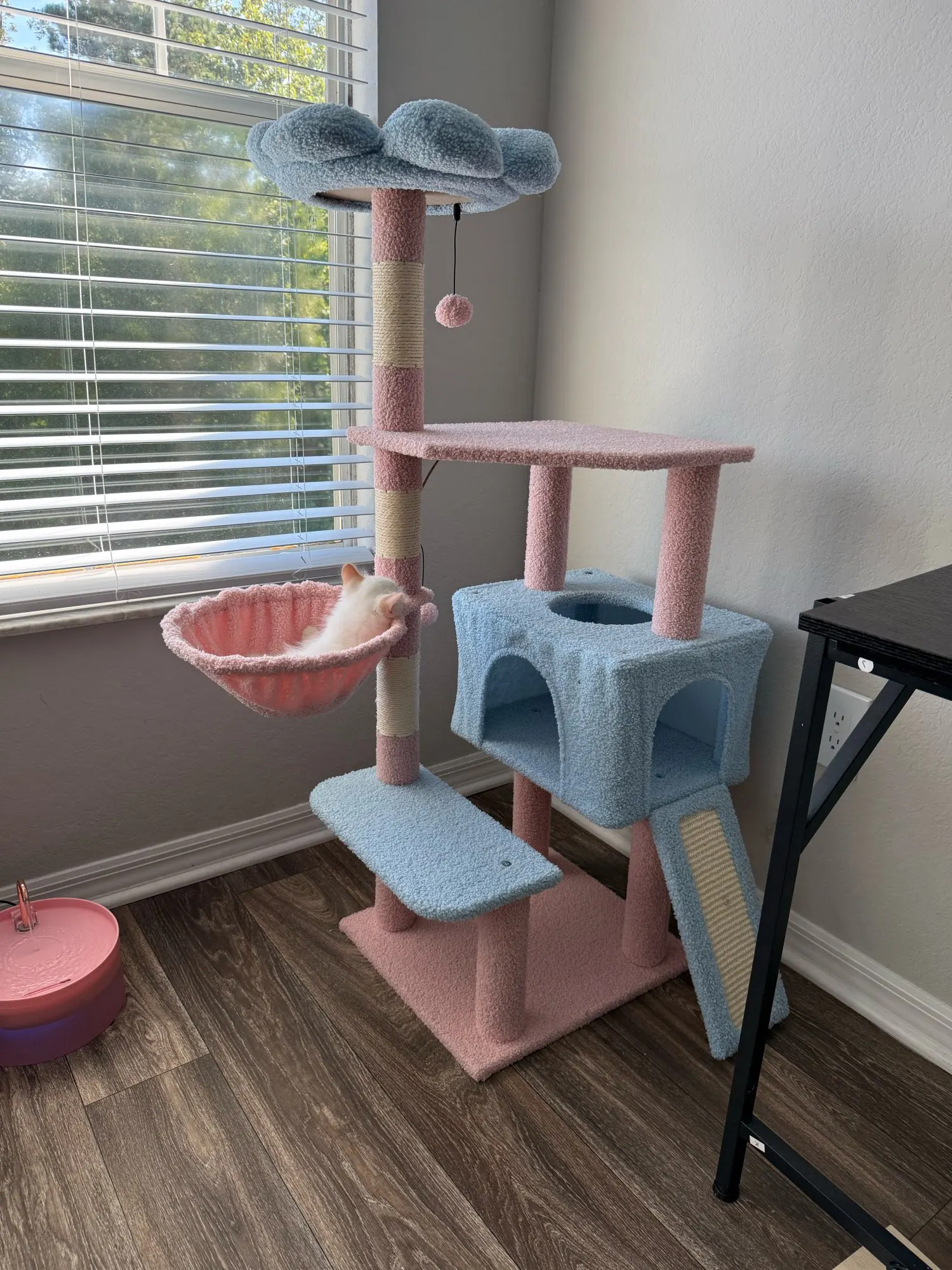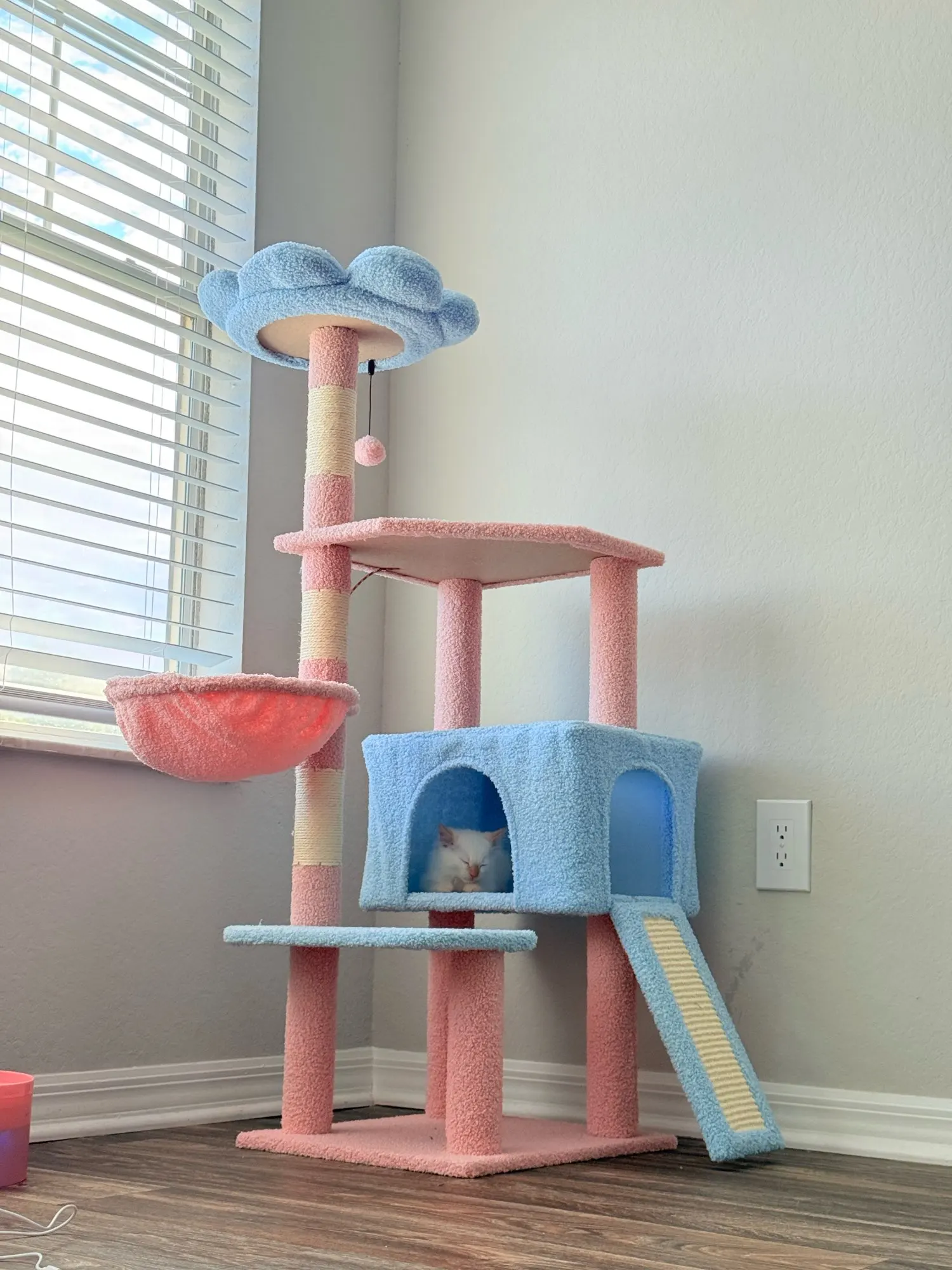 Transform your home into a feline wonderland with this delightful flower-themed cat tree! The combination of multiple levels, scratching posts, a cozy hammock, and an enclosed condo creates the perfect environment for your cat to play, exercise, and rest. The charming floral design makes this cat tree a beautiful addition to your home décor while providing everything your indoor cat needs to stay happy, healthy, and entertained. Give your small to medium-sized cat the gift of their own blooming paradise!